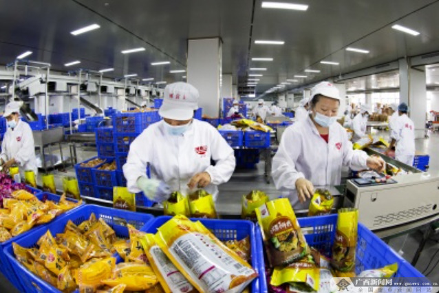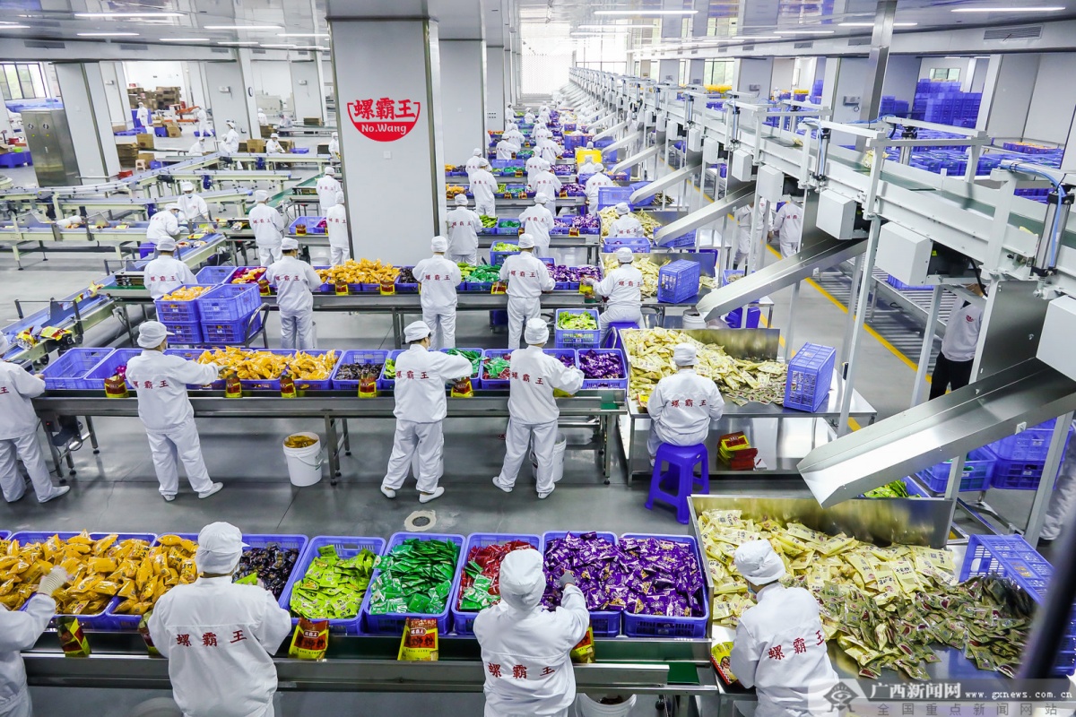 豆角清洗漂烫,腌制后切丁,经过密封包装、杀菌消毒、异物检测,又通过设备通道进入下一个环节,不少小朋友对着飞速运行的流水线年起,螺霸王洛维产业园的车间三楼,多了一排参观窗口。